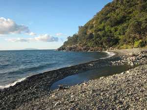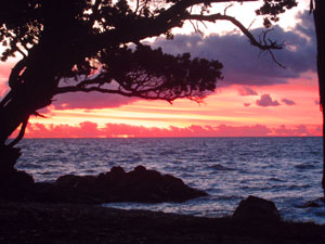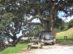 where we camp under a magnificent Pohutukawa tree, right above the beach.