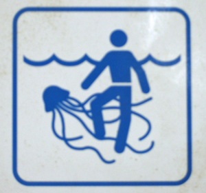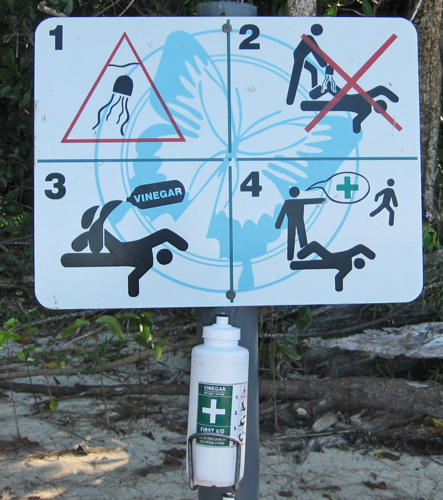 Instructions for stinger injury: don't pull stingers off, neutralize with vinegar, call for help. Australia has a number of stinging jellyfish varieties, two of which can be deadly. Swimming beaches are netted for sharks and stingers, though stingers may slip through. We have been advised to wear full-body lycra stinger suits if we swim.