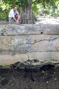 With our rental car, shared with Pax Vobiscum to split the cost, we toured Huahine today. The island is lovely - beautiful green valleys and hills overlooking turquoise lagoons. We wound around the lake at Maeva where we visited ruins on ancient villages, well documented by signs explaining the structures and customs. A little further on we took a motorized outrigger ride to a pearl farm where we got a small demo of how pearls are seeded and visited the gift shop. Looking at prices, we were glad we bought our pearls in the Tuamotus. At Faie, we stopped at the bridge to feed the blue-eyed eels. About 20 eels live in several holes in the bank of a shallow stream. The eels are sacred, credited from old times with bringing fresh water to the village. Dave brought some of Opal's sardines, and tossing bits into the water, was able to draw them out of their holes. They were 4 feet long, as thick around as our calves. Yow. Dave would not climb down and hand feed them. We continued on, circumnavigating by car both Huahine Nui and Huahine Iti, seeing the districts that had submitted teams for the dance competition. It is surprising that this thinly populated island could stage such a great show. |