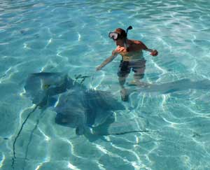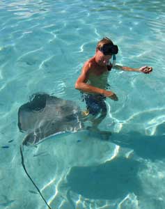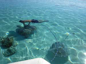Dave ties the dinghy to coral, and the first ray comes.