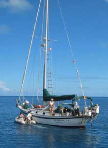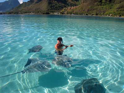 Today we had one of those rare omigod-I-can't-believe-this experiences. We are anchored inside the reef at beautiful Opunohu Bay on the north side of Moorea. The day dawned bright and sunny and calm. Our friends, Tom and Dawn on Warm Rain guided us in our dinghies across the bay to a channel, marked by buoys, for a mile or two to an area near the Hotel Inter-Continental. A half-dozen other skiffs and dinghies were already there, anchored in 4 feet of clear water over white coral sand. The attraction is several dozen large stingrays who come to be hand-fed. Dave tied our dinghy's painter to a coral head, then opened a can of Opal's sardines. Soon a half-dozen rays were eating out of his hand and climbing on him looking for more. He learned to hold his hand flat, thumb in, but was still bitten twice, more pinched than chewed, though one slightly broke the skin. A few larger boats arrived carrying more tourists from the hotel. The rays seemed to recognize these boats and literally swarmed up the backs of the men feeding them raw fish. By this time the rays were everywhere. You could see that some had two stinging barbs in their tails. We waded among them in chest deep water, and Dave continued to feed them sardines. Then the black-tipped reef sharks arrived, cruising among the waders, moving much faster than the graceful rays. Dave feed them too, though not by hand! We stayed an hour, snorkeling and wading among the rays and sharks. When the sharks began outnumbering the rays, we hopped back in the dinghy and went a little further on to snorkel between two small motus - islets on the outer reef, in beautiful healthy corals with nurseries of tiny tropical fish. Ok, this IS paradise! We are back home. Dave is scrubbing the hull, swimming around the waterline. |