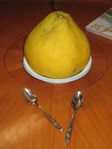 Gigantic pamplemousse sits atop soup bowls.