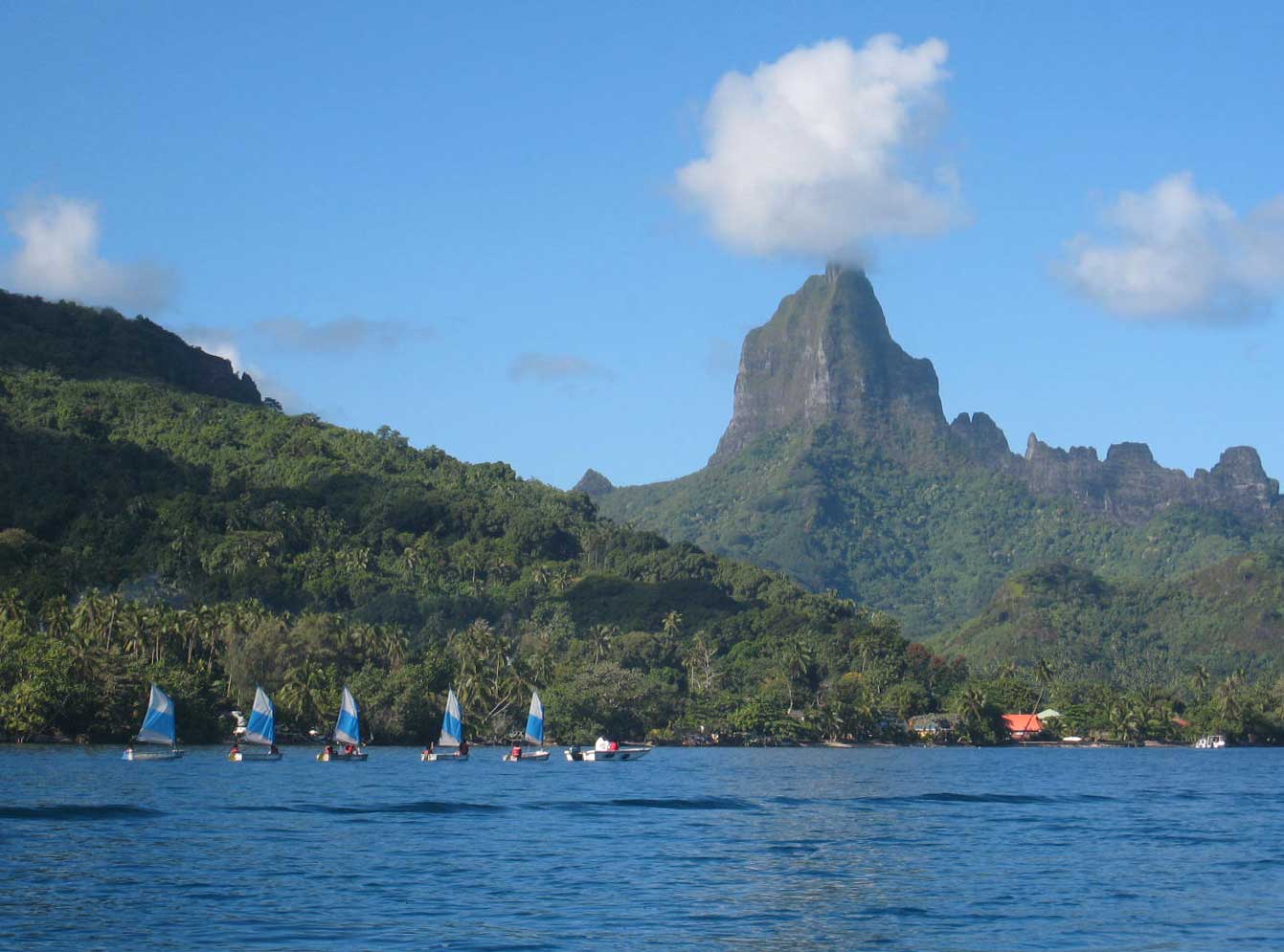 Yesterday we sailed around the corner into Cook's Bay, Moorea. Just how many bays are named after Captain Cook? And how did he manage to make it into this one, through the reef entrance in a square rigger? I know he sent longboats to explore first, but it amazes us that he visited these places with no charts or aids to navigation. The fringing reef is almost continuous, and you thread through at an angle marked by buoys. The bay is spectacular - towering peaks and ridges, draped in mantles of rich greens. The sun and clouds change the view every few minutes. We simple gape in wonder every time we climb up the companionway. We found a good anchorage at the head of the bay, and explored the tiny hamlet. Moorea has no large town, only small villages around its perimeter rim. Too late for baguettes. A demain. Today I booted Dave out of bed early enough for the baguette run, in drizzling rain. He came back with 4 loaves for us, and 4 for another boat. The store was sold out by 9 am. We had a yum breakfast of banana-walnut pancakes, then went back into shore for a long walk on the perimeter road. This afternoon pulled anchor and motored out through the reef pass, then 2 miles west to the nest entrance into Opunohu Bay, possibly even prettier than Cook's. Just inside the entrance we turned left into a lagoon, joining 20 other boats at anchor. I dropped the hook into 13 feet of water over white coral sand in crystal clear water. We can see every wrinkle of the bottom. Should be great snorkeling here! |