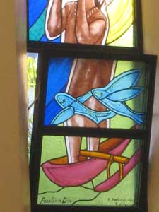 The church has flying fish stained glass.