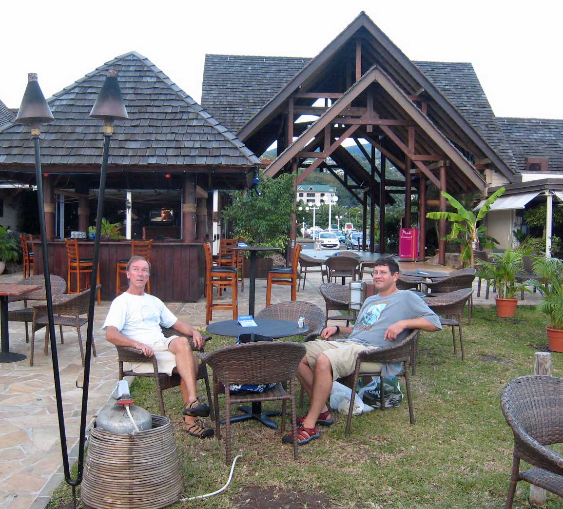 We are having fun in Papeete, catching up with cruising friends, doing small projects, and exploring Papeete. This morning we took on duty free fuel - about $4.50 a gallon. Dave has been reading an article how to turn the boat in its own length, tried the technique and it worked! Ploynesian Yacht Services is getting a pulley pressed on our new water pump, and preparing our clearance papers. Our last port in French Polynesia will be Bora Bora, but this is the only official port, so our exit clearance happens here. We motored inside the reef back to downtown, crossing the airport runway twice after getting permission to proceed from Port Control. We found an open spot on the town quai, and are now med-moored bow-in, our stern attached to the corps mort (dead bodies - big cement blocks) with sturdy lines. We will stay here 3 nights, enough to top up the batteries, and get some laundry and cleaning done with dock water. And play - the market is a few blocks away, as is the chandlery. Traffic roars by the quai, but it is nice being so close to amenities, and we hear everything quiets down at night. We are just a block from les roulettes, yum, and 3 blocks from a good bakery. We have our priorities. |