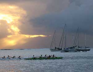 We enjoyed our 3 days at the downtown Papeete Quai, shopping at the chandlery and grocery. We got our propane refilled when Rudy from Shiva picked Dave up and they dinghied to the tanks at the airport. Mike from Polynesian Yacht Services finally delivered a new water pump with a pulley installed, after finding our old pulley would not fit the new pump. Expensive! But we are happy to have it. Laurent of PYS delivered our Polynesian exit papers. We are ready to move on again. Yesterday was the Tahiti-Moorea Sailing Rendezvous, hosted by Polynesian Tourism and Latitude 38. We had agreed to take 3 guests aboard for the crossing to Moorea. We untied from the quai, and promptly backed over the line holding the adjoining boat, Horizon, wrapping their line on our prop. One of our guests jumped in the water and unwrapped the prop, and soon both boats were freed. We motored out the bay, squeezing by maybe a hundred outrigger crews lining up for a race. Outside the barrier reef we joined 30 sailboats, all bobbing around in zero wind. After an hour, the "race" was called and we were given permission to start our motors. We motored the 10 miles to Moorea, arriving at the narrow pass at the same time as the ferry. We popped in, then turned right, to be greeted by people standing in outrigged canoes, in Polynesian costume, blowing conch horns and calling "iorana", welcome. We found a good spot to anchor, and settled in with our guests. After a cooling swim over the side, and a cool beer, we were ready to go ashore for the party. On the way in, we passed Horizon, being towed back out in their dinghy. They had hit a coral head and lost their outboard prop. Dave dropped us ashore, and returned to the anchorage to give them a ride in. We were greeted with flower leis and coconut juice, then fed a gigantic meal. Games were organized, a rock lifting contest. spear throwing at a coconut mounted on a tall pole, and outrigger races. Dave and I climbed into separate 6-man outriggers, each manned by 2 professionals, carrying 4 cruisers. We raced to a mark, turned and raced back. Hard work, but the canoes are swift. One boat forgot to lean left against the outrigger, and flipped over 3 times. Dave participated in a weight carry, 4 coconuts and 4 hands of bananas tied to the ends of a heay pole. He faded fast, but afterwards in looking at the other poles, realized he had picked the heaviest load. A local group put on Polynesian dance show, lots of great hip flipping, and wonderful drumming from an 8-piece band. They pulled cruisers from the audience to dance, but we obviously don't have the muscles or skill. After an awards ceremony with prizes, we headed home. Fun day! But our day wasn't over. Arriving in the anchorage we found that one boat had drug, crossing anchor chain with another. Someone came aboard during the day and rafted the two boats together, and dropped a 3rd hook. Soon a man was in the water, in fading daylight, attaching lines to anchors. Dave pulled one free, and both boats were able to re-anchor securely. We went home, picked up a bottle of wine, then picked up Horizon's crew and dinghied to Pax Vobiscum for "baguette pizza" and a fun evening recounting the events of the day and of cruising in general. Malinda recently asked me if this is truly "paradise". The answer is yes and no. The people are generous, the scenery is out of this world. Snorkeling is amazing. It is fun learning about a new (to us) culture, and figuring out how to get what we need in a new place, often with compromises, and to discover new foods. But every day also brings challenges, some pretty uncomfortable. I think the challenges are the spice that makes the rest so precious. A perfect life wouldn't be. |
