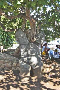 This tiki has 2 heads, but only a single shoulder, holding up the tree.
