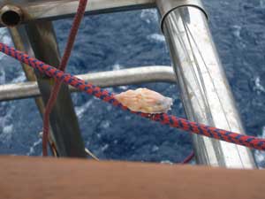Our hermit crab, Melville, picked up on the beach because Jan wants the shell, is cruising all over the stern. We found him on the lines to the windvane, hanging out over the water, then on top of an pencil urchin. Feels like we have a second pet aboard, and it is surprising how much entertainment he provides. Maybe that's really a reflection of the boredom of a passage...