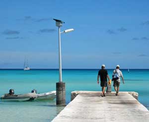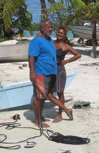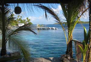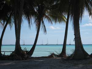 Dave determined our engine overheating is from loss of water from our fresh water pump. He had installed a new unit only a few months ago in Puerto Vallarta. He put the old unit back in, though it also has a small leak. By noon we raised anchor and again were on our way. We arrived at the south anchorage of Fakarava in time to join 3 other cruising boats for a dinner at Annabelle's dive resort. After a damp dinghy ride in, we enjoyed a great meal of parrot fish and curried chicken. The evening entertainment was supplied by the dozens of black tip reef sharks circling under the restaurant, which is built on pilings over the water. The other 3 boats have done the pass dive repeatedly and gave us advice. After our fun evening, we dinghied back to the anchorage, into big sloppy swells that tossed drenching spray in our faces. We were soaked through. Now the wind is howling and tossing the boat around at anchor. We have a rowdy night ahead. |