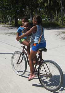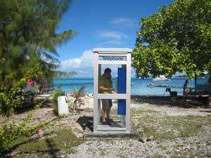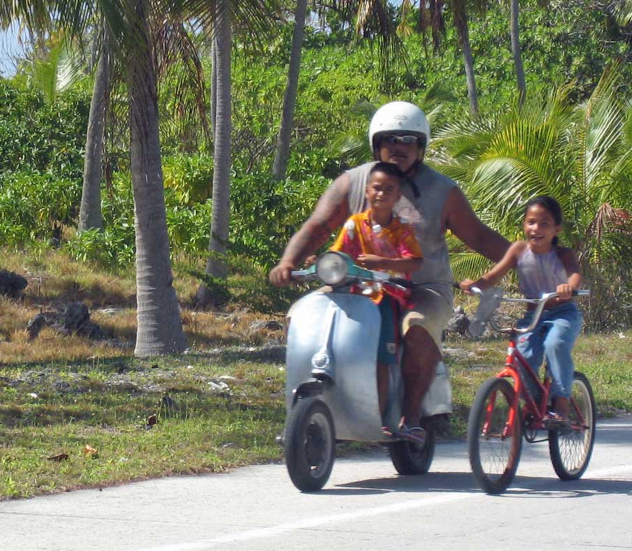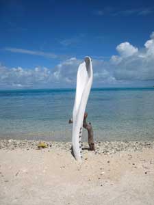 Lazy day. We tooted into the village late in the morning to deliver a thankyou bottle of wine and 2 papaya to our friendly fisherman benefactor. His response was more gifts, beautiful cowrie shells from nearby Taiaro, collected in the right moon, and a carved shell pendant. I think this is a Polynesian thing, being the last one to give a gift, like having the last word. We explored the town motu, walking down streets to the waters edge, then looping back to the cemetery. Half the gravestones, grouped together, were for tiny children, less than 5 years old. Epidemic? High child mortality rate? Dunno, but town cemeteries are always interesting, The supply ship Mareve Nui arrived today, dropping off supplies by barge, including a new pickup, rumored to cost 100K, and picking up copra, dried coconut, which will be processed into oil in Papeete. Diesel is delivered in drums to fuel two generators, so the town has electricity and even satelite TV. But except for the single small grocery, there is nowhere to spend money, no shops, no restaurants or pensions, and no tourism. Everything must be ordered and delivered. I think it is a very happy life for those who are content without a lot of material possessions, who can appreciate the natural beauty of these atolls. But the people must be hardy, to survive with collected rainwater, withstand drought, and pull their living from the lagoon or coconut tree. We also wonder if these atolls will be affected by global warming. In one account, estimates are 50-100 years before sea levels rise enough to cover the atolls in storm surges. If the rise is slow enough, can coral growth keep up? Tomorrow morning we head next door to neighboring atoll Fakarava, where our friend Brett is flying in. |