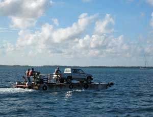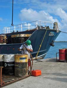 We are excited to find gas for the outboard. The Cobia crane drops a palatte of barrels on the dock, and this man has a hand pump. |