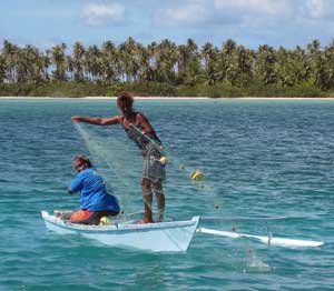 After a big breakfast of banana-walnut pancakes, pamplemousse and fruit smoothies (legacy of the Marquesas), we dinghied ashore, tying up to the church quai. We met several German cruising couples, all dashing in after seeing the plane from Papeete land. The weekly plane delivers stock to the single store on this atoll. Today's haul included fresh baquettes, sold out in 30 minutes, still at 60 cents each despite the par avion delivery. The French have their priorities! Dave delivered our baguettes to the boat while I explored with Dawn of Warm Rain down the crushed coral street. We met a man who was heading out to fish. He recruited us to help fold his net into his small outrigger canoe, then handed me a line tied to one end of the net. He called to his "femme" to come. She climbed on the stern while he paddled out into the lagoon, then she stood and paid out the net in a large curve while he paddled. Then the man came ashore and waded chest-deep under a dock where he cartwheeled his arms, splashing noisily to scare fish basking in the shade into his net. A few minutes later the man and woman hauled the net back in to the outrigger - teaming with hundreds of small fish. We followed them onto the dock and spent the next hour and a half pulling the fish from the net, filling a 5-gallon bucket. They showed us how to pinch the fish at the gills, and pull them face forward through the net, as you couldn't pull against their gills. They advised us (in French) how to clean and cook the fish, and gave us 2 large bags full. We walked to the NE side of the atoll, and beachcombed, finding a few shells, and a lot of plastic debris from distant places. The exterior reef looks very unforgiving. Back in the lagoon, Dave and I cleaned our catch, then went snorkeling under an abandoned pearl farm. Beautiful corals, and a huge variety of colorful fish, including some large grouper. We won't eat fish here unless the locals do - as there is danger of ciguatera, so we were happy to have our catch of the day. Tom and Dawn came to dinner, and I fried the fish in olive oil with plenty of garlic, accompanied by salad and baguette. Delicious! Happy Opal got the last leftovers. Fun day! It is very beautiful here, and different from the verdant and steep Marquesas. The atoll is flat - no more than a dozen feet above high water. You can see that the storm surge of a cyclone could overtake the atoll. The sea inside is a calm lake of kodak-postcard colors, pale pastel aqua, emerald, turquoise, teal, then deep blue falling away into depth. |