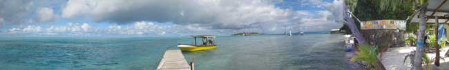 Still on our mooring buoy. Dave says it is attached to a coral head. We are having a lazy day, snorkeling around the boat to clean the waterline, and reading the week-old NY Times brought by Pax Vobiscum's guest. I swam over to another boat Dave was visiting to swipe an oar from our dinghy. Dave got a tow home, and told me quick, we need to put the motor on to go looking for the oar! I had to confess. More rain today! We are talking with Pax about leaving tomorrow for Papeete, though the seas are large - 3 meters, with short interval so it will be an uncomfortable ride. But it gets no better as the week goes on. Fortunately it is a short passage - only 2 days, but it sounds really miserable. We will wait another day to see if the reports improve. |