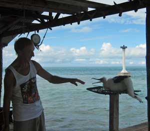 We left the south pass of Fakarava 2 days ago and headed up inside the reef toward Rotoava. We anchored overnight halfway along for reef exploring, seeing 2 black-tip sharks in small lagoons, and a lot of interesting shells, including coconut crabs, one perched on top of a stick. Lookout duty? Yesterday we sailed the rest of the way to Rotoava. Blue Plains Drifter told us where to find Poeata Creations, to buy black pearls, and Tiffany provided valuable advice ("If in doubt, buy both!") Back at the town hall, Brett and I did laundry in buckets until we were busted for doing it in a public place. So we packed up and did the rinse cycle back aboard. This morning Dave rowed ashore to pick up the baguette order. We then bashed out through the pass against an incoming tide, and sailed to an atoll just north, Toau, to tiny Amyot cove. Several boats ahead of us advised of this peaceful and pretty stop on the lee side of the reef. We arrived late afternoon after a boisterous sail, and are happy to be moored in this quiet spot, planning to spend several days. A skiff motored out to greet us and tie is to a mooring ball, our first since Catalina Island in 2006. We have a list of maintenance to do before the Papeete passage. We had one fire drill today - the shaft brake set screws came loose, and we had to lie ahull in rolly seas while Dave backed the screws out, to be fixed here. |