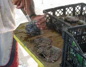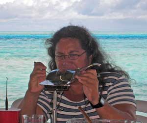 Today we went ashore to watch Valentine open oysters her husband Gascon had brought from the pearl farm motu. Unfortunately, he selected a string too young, and the pearls were not mature. Valentine tossed one over her shoulder into the lagoon, and several more were hardly worth keeping. After a man pried them open and inserted a small wedge, Valentine went searching with what looked like dental tools for the single pearl, while the oyster was held in a special clamp. We were impressed by how labor intensive this work is. Each oyster produces only 2 pearls in its lifetime, one at 2 years, the other at 4 years. The irritant seed is made from shell, which comes from Mississippi! The oyster rejects any manmade material. Afterwards Valentine let us select and buy some unmounted pearls. We were impressed with the variety of colors and quality. I traded shampoo and perfume for 10 keshis, tiny malformed pearls, that I wanted for an ankle bracelet. I also gave Valentine a large container of dried Parmesan cheese, and she promises me one more pearl tomorrow. The supply boat Cobia visits Toau once a month. coming to the lagoon at the other end of the atoll, so it is hard for the dozen people living here to get supplies. I also gave Valentine two large chocolate bars from the Zihuatanejo dollar store, which made her pretty happy. Wish I'd brought more! |