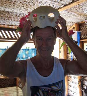 We are attached to a mooring buoy at Toau. Yesterday and today we had nearly continuous rain, sometimes a pounding deluge. Brett and Dave spent a couple hours trying to rig the foredeck awning to catch rainwater for our tank, with little joy. I used a small blue tarp and had slightly better luck. Today I tossed our laundry in the dinghy, half full of water, and soaped and rinsed. The trick will be to get it dry between squalls. Brett and I rowed ashore to meet Valentina. She and Gascon had just killed a young pig, hanging from a rafter, and the boats in the anchorage were invited to dinner. At 7pm we dinghied in for the feast, meeting several European boats and joining Pax Vobiscum, a group altogether of maybe 20 people. Valentina served tuna sashimi, goat stew and rice, baguettes, fresh grilled fish, and cake for dessert. We were happily stuffed. Tomorrow morning we will go ashore to learn more about the pearl farm. |