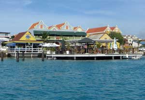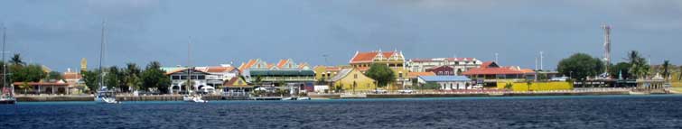 The alarm woke us at daybreak, and we cast off from our Bonaire buoy by 6:30. Dead downwind, 20-25 knots all morning, rowdy seas. We rounded the south end of Curacao just after noon, and had the hook down inside Spanish Waters by 2 pm. Spanish Waters is an extensive maple-leaf shaped lagoon, completely landlocked though exposed to wind. We entered the zigzag channel, going from surfing ocean waves to calm in a few hundred feet! There are reefs lining the edges, so some care must be taken to stay centered in the channel. A couple more turns, and we found a good anchorage spot in permitted area "B". We flopped the dinghy into the water and motored to the dinghy dock at Fisherman's, just missing the bus to town. After waiting an hour, we caught the next one, arriving minutes too late for Customs. We did get cleared in with immigration, will do the rest on Monday, including payment of our $10 anchoring fee. We figured out how to bus back to the boat, arriving home before sunset. Willemstad looks charming - lots of tall skinny 18th century Dutch buildings, painted every crayola color. It is really 2 towns, Punda on the south, and Otra Banda in the north, connected by a cool pontoon bridge that swings open often for any boat traffic.
