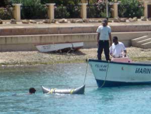 With a slight lull in the trade winds, we dinghied the half mile across to Klein ("little") Bonaire, the small barren island that nestles in Bonaire's armpit. Our map showed it ringed with yellow buoys, marking dive and snorkel sites. We passed the ferry landing and "No Name" beach, and tied to the buoy at Leonora's Reef. Slipping over the side, we explored the healthy coral garden with many colorful fishes. The waters here are warm and clear. We followed a turtle swimming slowly below us. Back in the dinghy, we set off windward for big Bonaire. By this time the midday winds had piped up, with large choppy waves breaking over our bow and almost swamping the dinghy. Dave used my mask for vigorous bailing, until he tossed it overboard. The $25 dive tag went with it, dang! Eventually the waves laid down and we made better time.