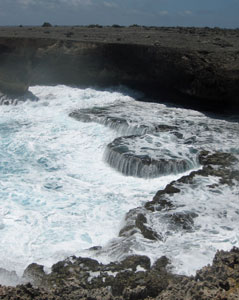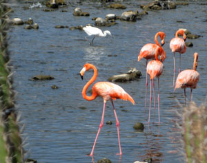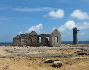 Yesterday we shared a truck rental with Wings and headed to Washington Slagbaai. Nearly a third of the island has been set aside for this undeveloped park. On the way we passed through Rincon, a small town that was built in the interior to hide from the Spanish and English pirates who raided these waters. At the park gates our dive tag receipt and photo ID allowed us free entry, but if you had only bought snorkel tags it was another $15 pp, which was the difference to dive tags! The entry gate had a small but good museum, including a whale skeleton that had arrived at Bonaire impaled on a cruise ship, and interesting signs for the toilets. We rolled on to beaches on the windward side - a nice day to not be sailing! At Malmok we climbed around the ruins of a home and windmill built of coral and stucco, then apparently walked too close to the ground nests of small white birds. They did screaming kamakazi attacks at our heads. In salt pans we saw lots of pink flamingoes, with their impossibly long legs, backward bending knees, and black-tipped beaks. The underside of their wings also is black, visible only when they are flying or air-drying. Saw wild goats and donkeys, lots of lizards but only glimpses of the larger iguanas. Lovely day.