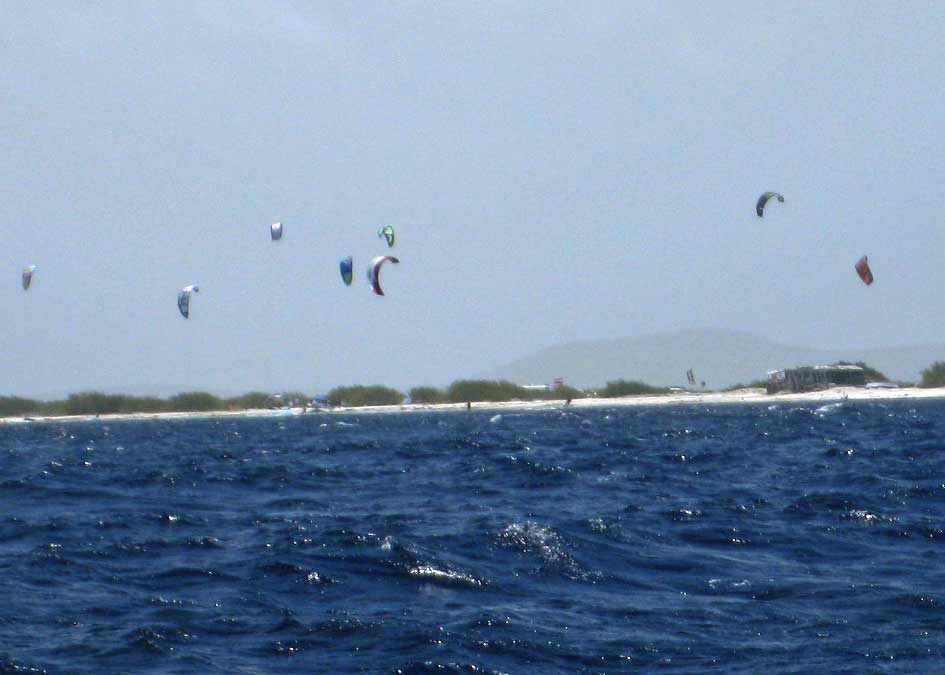 Today we settled our mooring account at the marina, saying goodbye to Carlos, the delightfully helpful manager there. We stopped by the Douane and Immigration and cleared out of Bonaire, then rented a scooter for our last day of exploring. The little 100cc Yamaha whined along fairly well, but definitely slowed when we had headwinds rounding the south end of Bonaire. We worked along the huge pinkish salt pans, stopped at the tiny slave huts that once housed the salt workers, and spent a fun hour on the south end watching a kite surfing competition. Further on we came to Lac, a huge lagoon on the windward side, where we enjoyed lunch while watching beginner wind surfers. The lagoon is brilliant green, waist deep, with steady 20 knot winds, perfect for learners. We rolled on back to Kralendijk and returned the scooter, then stowed the boat for tomorrow's early departure. Time for a final snorkel - Dave saw barracuda, and I found a cute pufferfish hiding in a coral bowl. Bonaire has been fun, but it is time to move along. Tomorrow we will rise early for the 6 hour dash across to Curacao, the next island in the ABC chain.